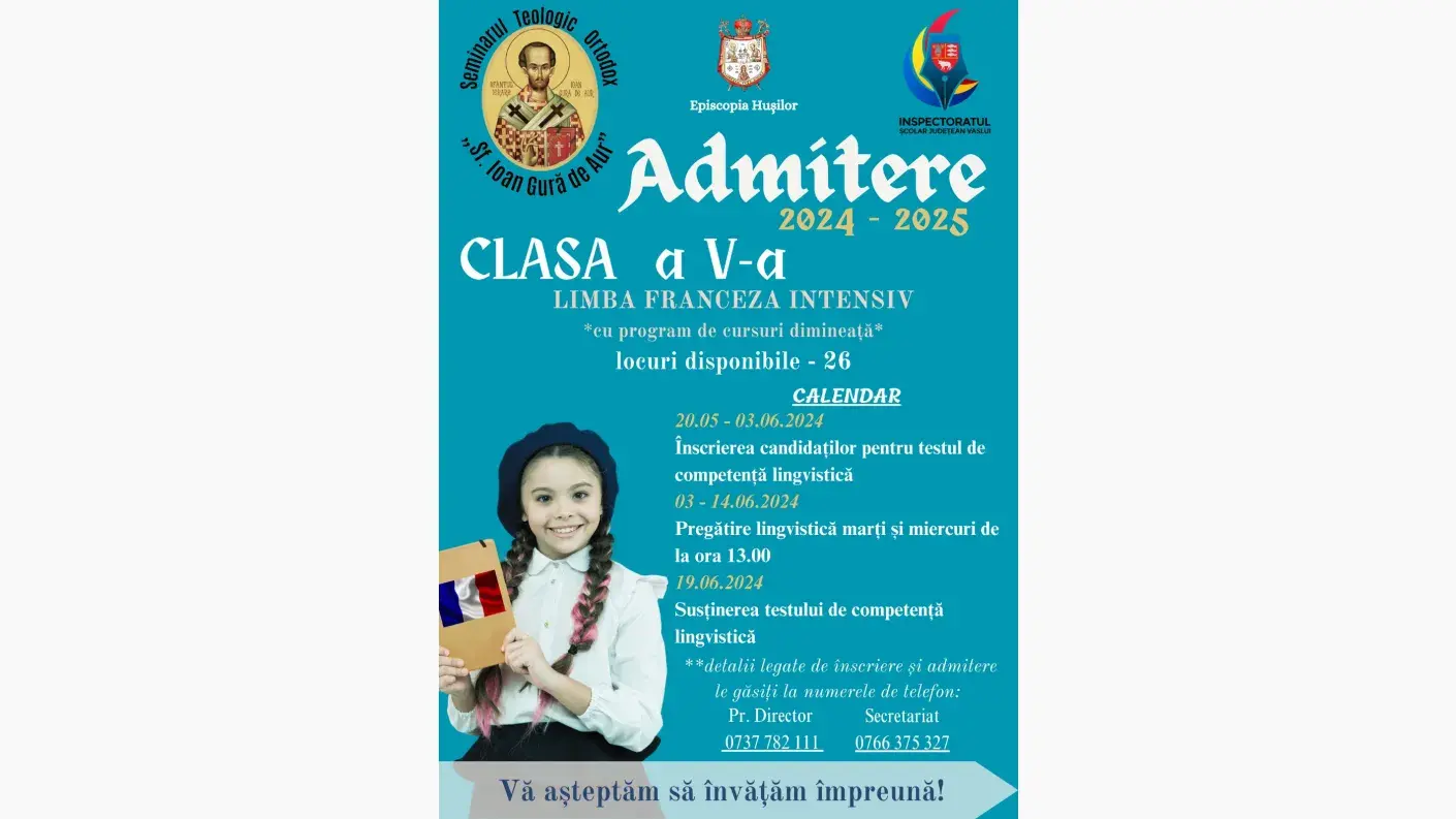Seminarul Teologic Liceal Ortodox „Sfântul Ioan Gură de Aur” din Huşi propune pentru anul școlar 2024-2025, două clase a IX-a de liceu și o clasă a V-a de gimnaziu, având specializarea franceză intensiv, după cum urmează: