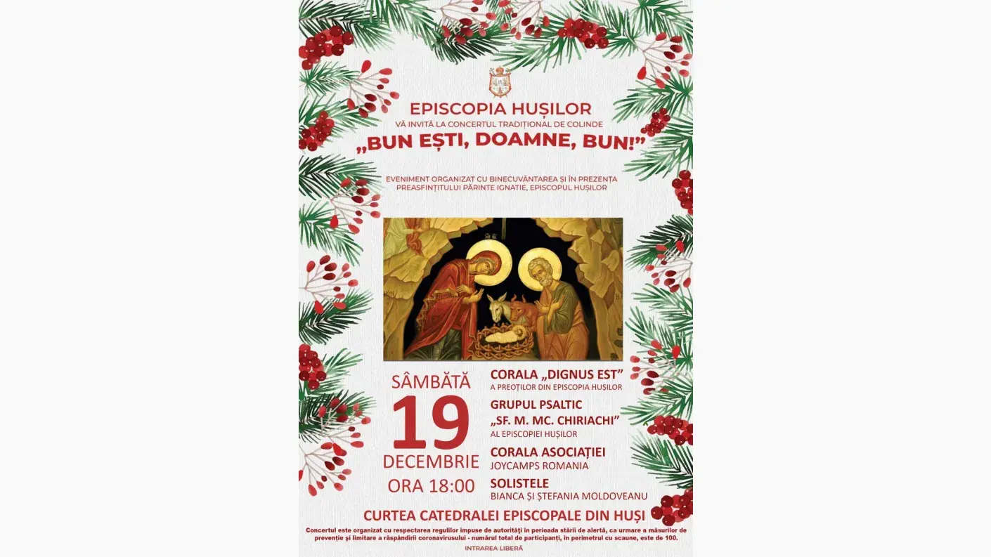 Sâmbătă, 19 decembrie 2020, începând cu ora 18.00, Episcopia Hușilor organizează, cu binecuvântarea şi în prezenţa Preasfințitului Părinte Ignatie, Episcopul Hușilor, concertul tradițional de colinde intitulat „Bun ești, Doamne, bun!”