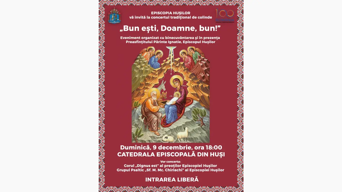 Duminică, 9 decembrie 2018, începând cu ora 18.00, Episcopia Hușilor organizează, cu binecuvântarea Preasfințitului Părinte Ignatie, Episcopul Hușilor, concertul tradițional de colinde intitulat „Bun ești, Doamne, bun!”