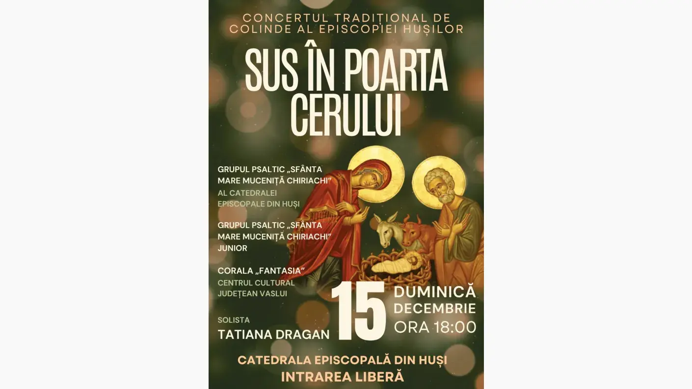 Duminică, 15 decembrie 2024, începând cu ora 18.00, Episcopia Hușilor organizează, în prezenţa Preasfințitului Părinte Episcop Ignatie, concertul tradițional de colinde intitulat „Sus în poarta Cerului”. Evenimentul va avea loc în Catedrala Episcopală din Huși.