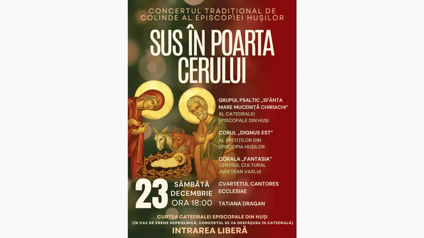 Sâmbătă, 23 decembrie 2023, începând cu ora 18.00, Episcopia Hușilor organizează, în prezenţa Preasfințitului Părinte Episcop Ignatie, concertul tradițional de colinde intitulat „Sus în poarta Cerului”. Evenimentul va avea loc în aer liber, în curtea Catedralei Episcopale din Huși.