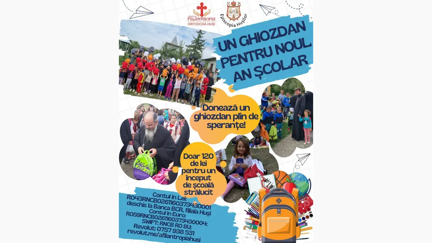 Fiecare donație de 120 de lei este o cărămidă de încredere, construind poduri către un început de școală strălucit. Să ne alăturăm cu inima deschisă, astfel încât niciun copil să nu fie lăsat în urmă, fără resursele necesare pentru a-și deschide aripile către cunoaștere și a-și construi propriul viitor”, a menționat părintele consilier eparhial Vladimir Beregoi, președintele Asociației „Filantropia Ortodoxă” Huși.
