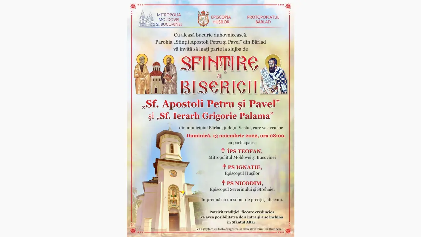 Duminică, 13 noiembrie 2022, Înaltpreasfințitul Părinte Teofan, Mitropolitul Moldovei și Bucovinei, alături de Preasfințitul Părinte Ignatie, Episcopul Hușilor, și de Preasfințitul Părinte Nicodim, Episcopul Severinului și Strehaiei, vor oficia, începând cu ora 08.00, slujba de sfințire a bisericii cu hramurile „Sfinții Apostoli Petru și Pavel și „Sfântul Grigorie Palama” din municipiul Bârlad.