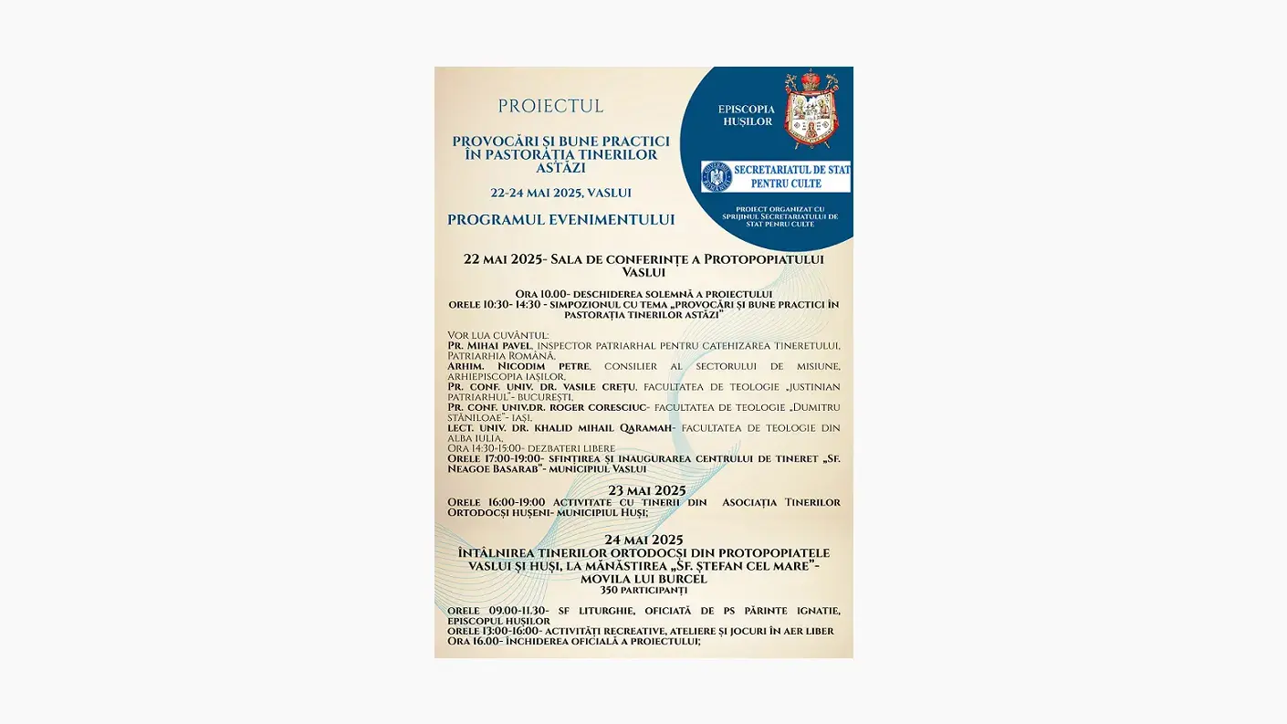 În perioada 22-24 mai 2025, Episcopia Hușilor, prin Sectorul activități cu tineretul, cu sprijinul Secretariatului de Stat pentru Culte, va desfășura proiectul „Provocări și bune practici în pastorația tinerilor astăzi”.