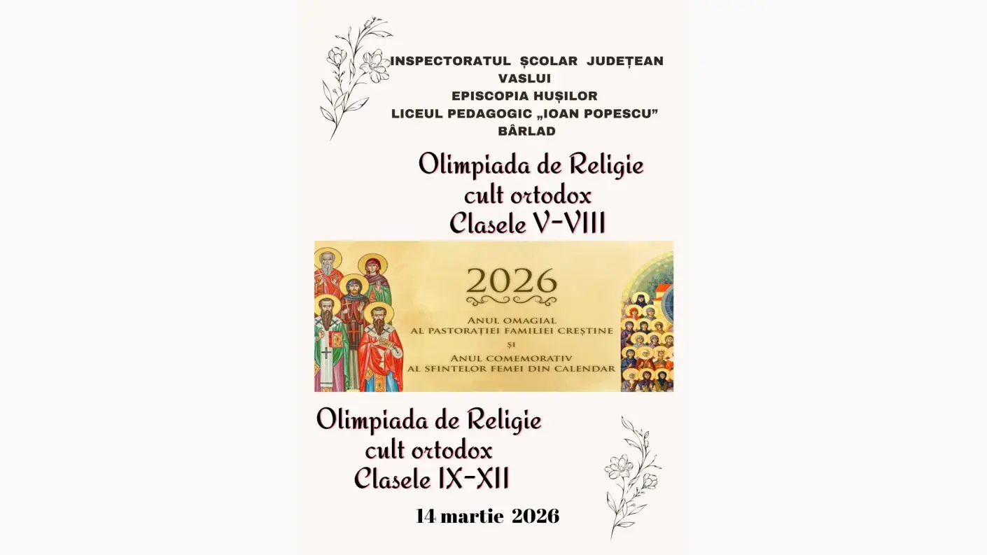 Sâmbătă, 14 martie 2026, a fost organizată la Bârlad etapa județeană a Olimpiadei de Religie din județul Vaslui.