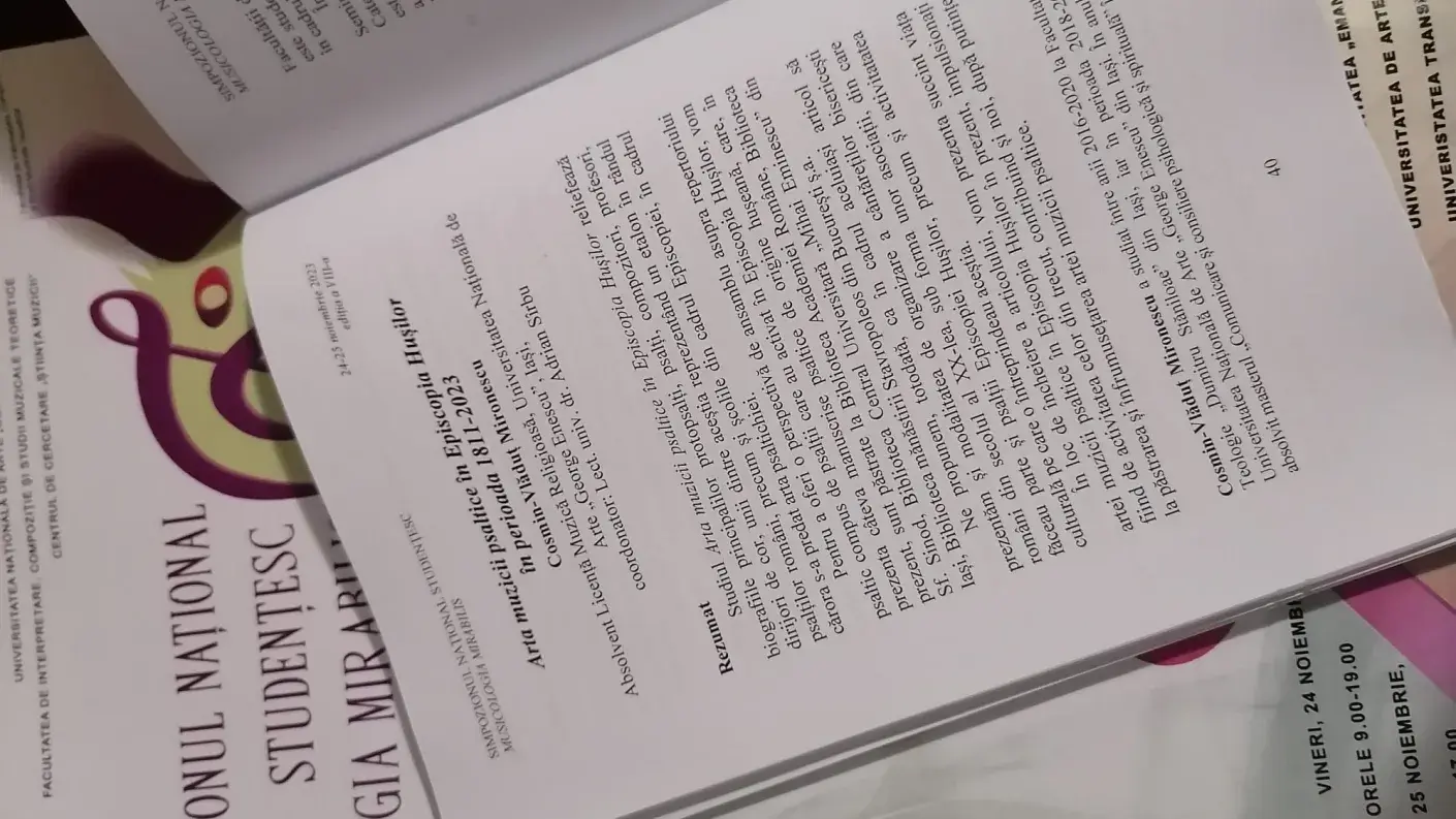 Cu binecuvântarea Preasfințitului Părinte Ignatie, Episcopul Hușilor, în perioada 24-25 noiembrie 2023, arhidiaconul Cosmin-Vlăduț Mironescu, slujitor al Catedralei Episcopale „Sf. Ap. Petru și Pavel” din Huși, a participat la Simpozionul Național Studențesc „Musicologia Mirabilis”, organizat de Facultatea de Interpretare, Compoziție și Studii Muzicale Teoretice, în colaborare cu Centrul de Cercetare „Știința Muzicii” din cadrul Universității Naționale de Arte George Enescu – Iași.