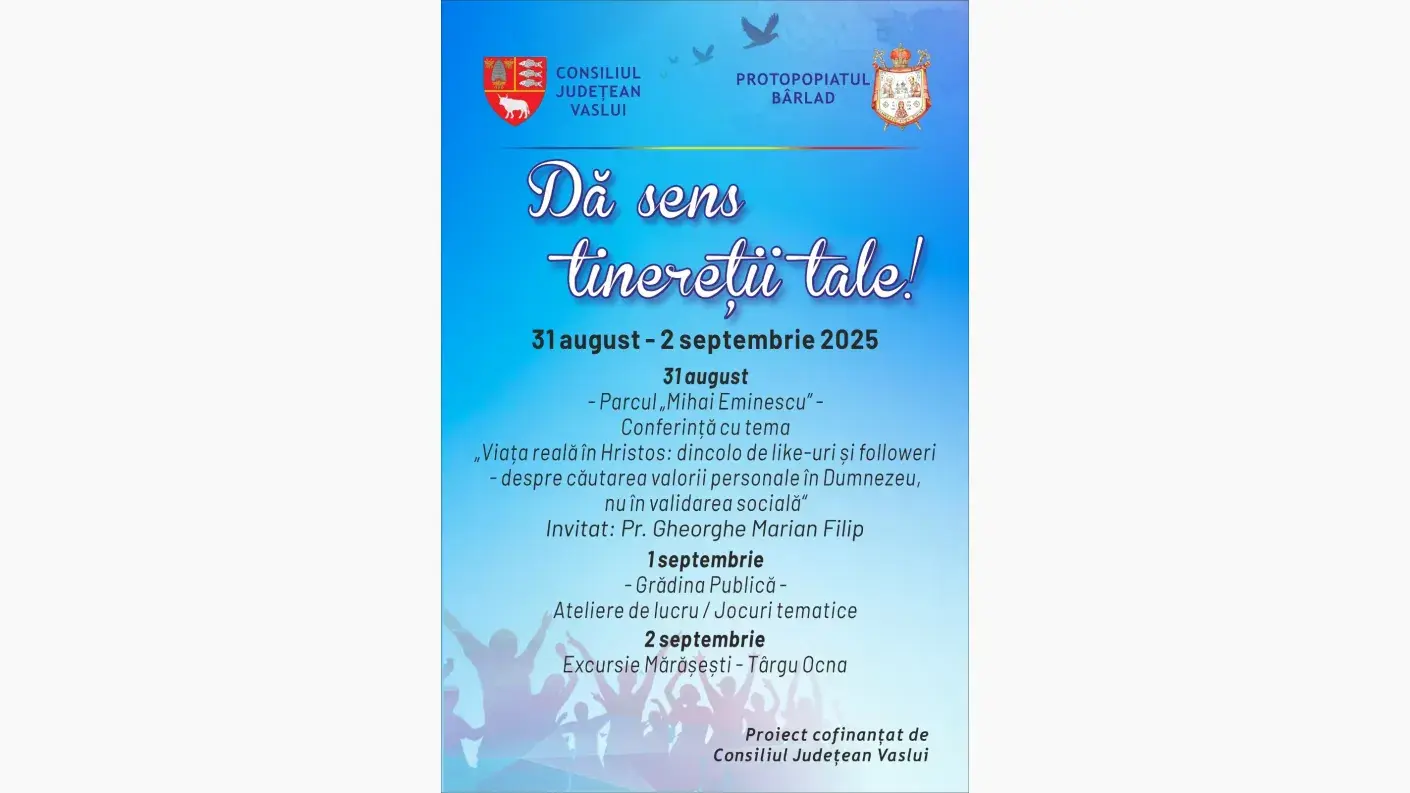 Cu binecuvântarea Preasfințitului Părinte Ignatie, Episcopul Hușilor, în perioada 31 august – 2 septembrie 2025, Protopopiatul Bârlad implementează proiectul „Dă sens tinereții tale”, cofinanțat de Consiliul Județean Vaslui.