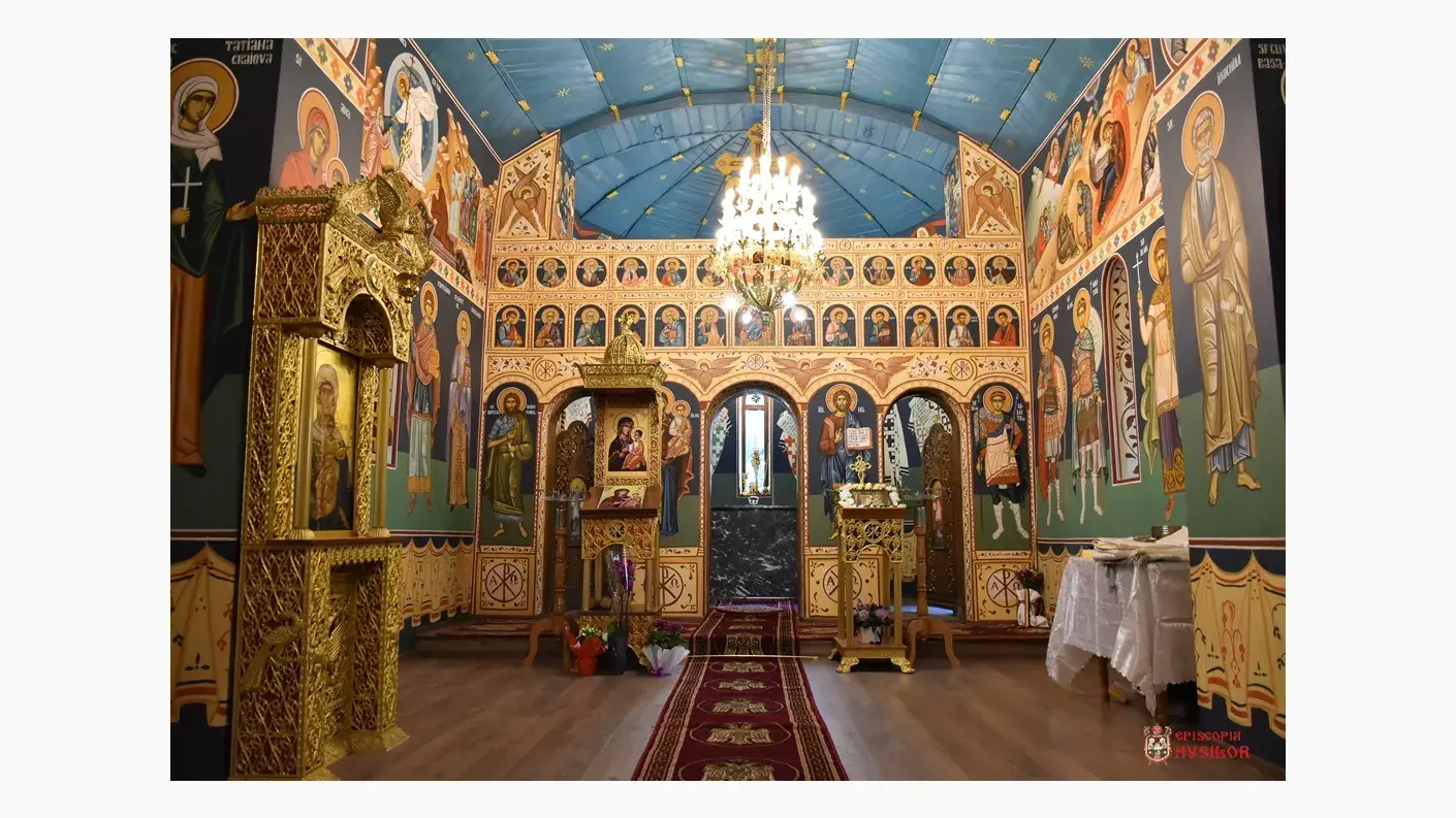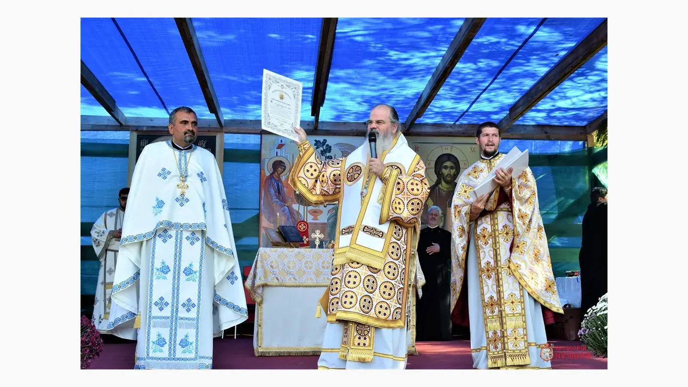 După slujba de resfințire, a urmat Sfânta Liturghie, oficiată pe un podium în apropierea locașului de cult. Răspunsurile la strană au fost date Grupul psaltic „Sfânta Mare Muceniță Chiriachi” al Catedralei Episcopale din Huși, coordonat de diaconul Vlad Mironescu.