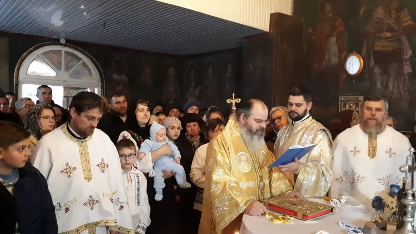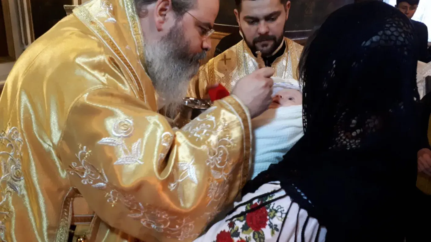 Sfânta Liturghie a continuat cu Taina Sfântului Botez, oficiată de Părintele Episcop Ignatie pentru pruncul Sava, primul copil al părintelui Andrei Mihălăchiţă, parohul Parohiei Sălceni.