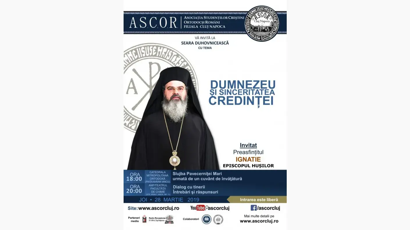 La invitaţia Asociaţiei Studenţilor Creştini Ortodocşi Români – Filiala Cluj Napoca (ASCOR Cluj), Preasfinţitul Părinte Ignatie, Episcopul Huşilor, va susţine joi, 28 martie a.c., începând cu ora 20.00, conferinţa cu tema „Dumnezeu și sinceritatea credinței”.