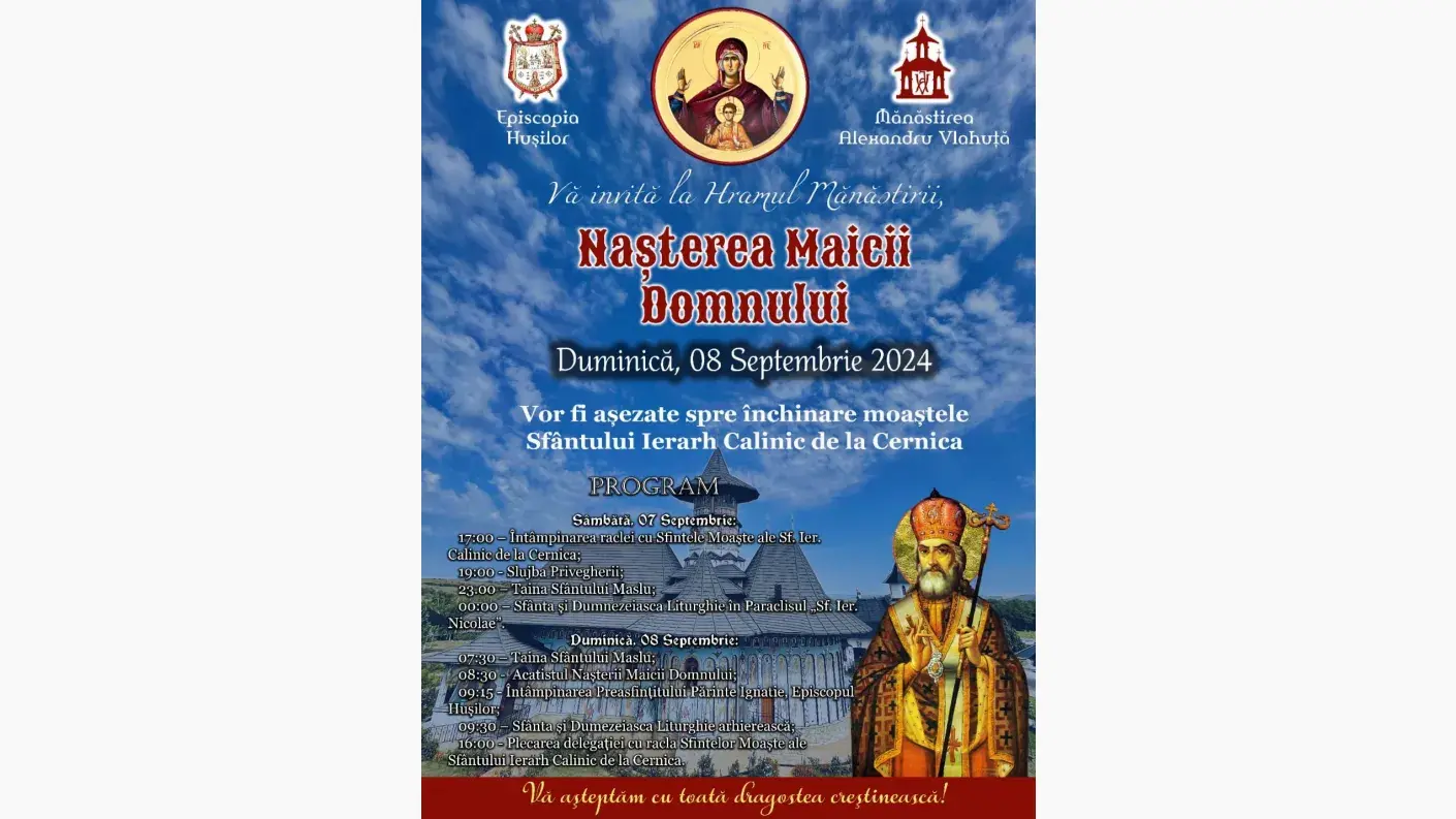 Duminică, 8 septembrie, de Sărbătoarea Nașterii Maicii Domnului, hramul Mănăstirii „Alexandru Vlahuță”, toți credincioșii se vor putea închina la Sfintele Moaște și vor putea participa, la programul de slujbă ce va începe de la ora 07.30, cu Taina Sfântului Maslu, apoi la Acatistul Maicii Domnului, iar de la 9.30, la Sfânta Liturghie, oficiată de Preasfințitul Părinte Ignatie, Episcopul Hușilor.
