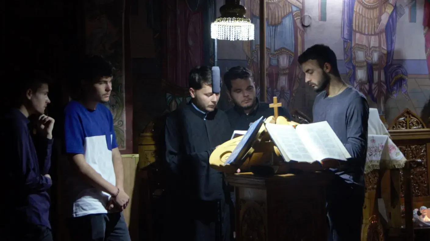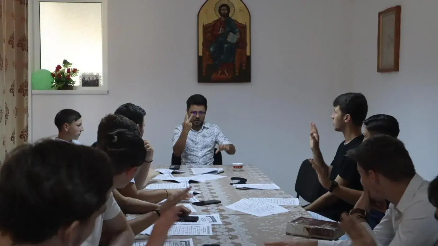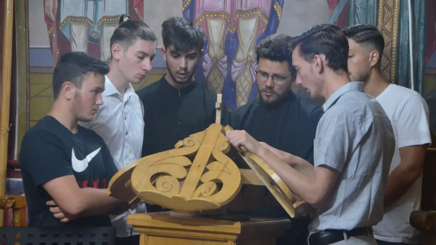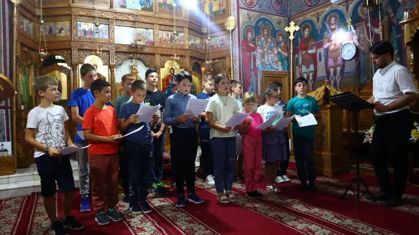 Simultan, cei 15 copii participanți au studiat, alături de diac. prof. Vlad Mironescu, troparul Praznicului Adormirii Maicii Domnului și al Schimbării la Față a Domnului.
